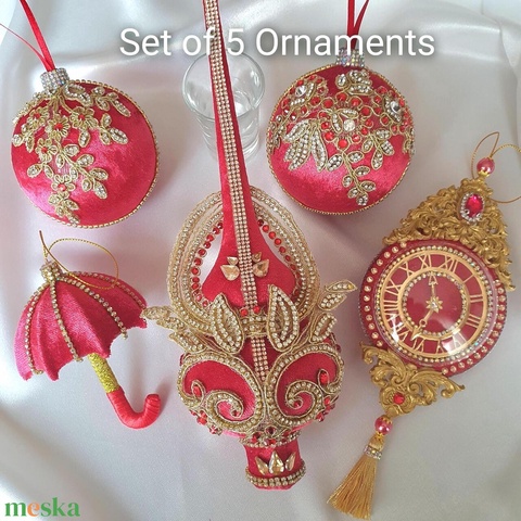 Exkluzív kézzel készített piros karácsonyi díszkészlet – bársony gömbök, csúcsdísz, mini esernyő, strasszokkal
