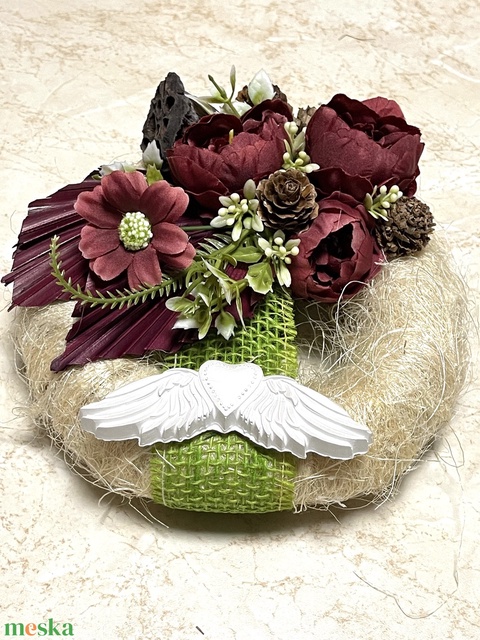 Sírdísz koszorú selyemvirágokkal, gipsz angyalszárnnyal díszítve