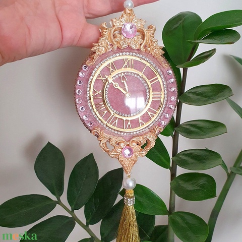 Kézzel készült rózsaszín bársony óradísz szett – vintage karácsonyfadísz strasszokkal és bojtokkal, elegáns dekoráció