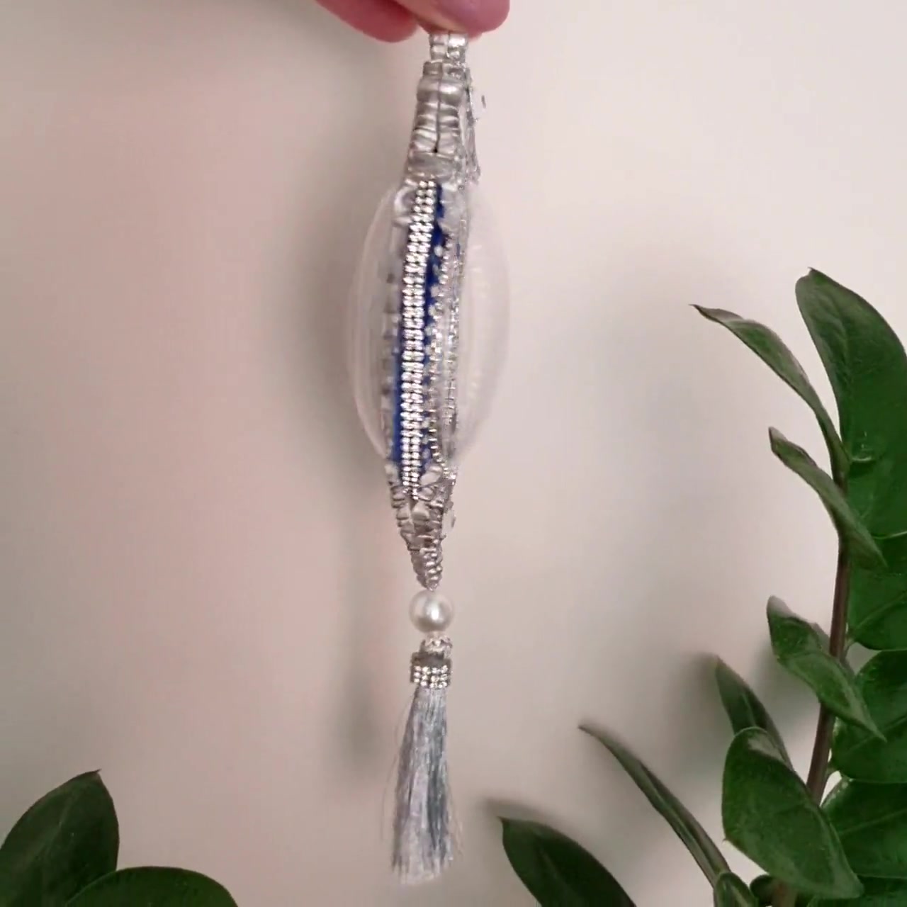 Kézzel készült kék karácsonyi óra – vintage dekoráció strasszokkal és bojtokkal, elegáns ünnepi ajándék