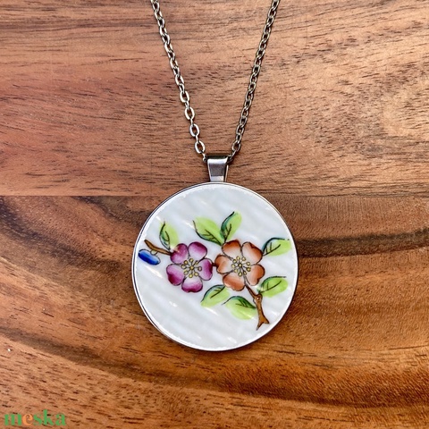 Herendi mentett darabok - nemesacél nyaklánc virágos porcelánnal, nagy medál