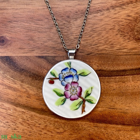Herendi mentett darabok - nemesacél nyaklánc virágos porcelánnal, nagy medál