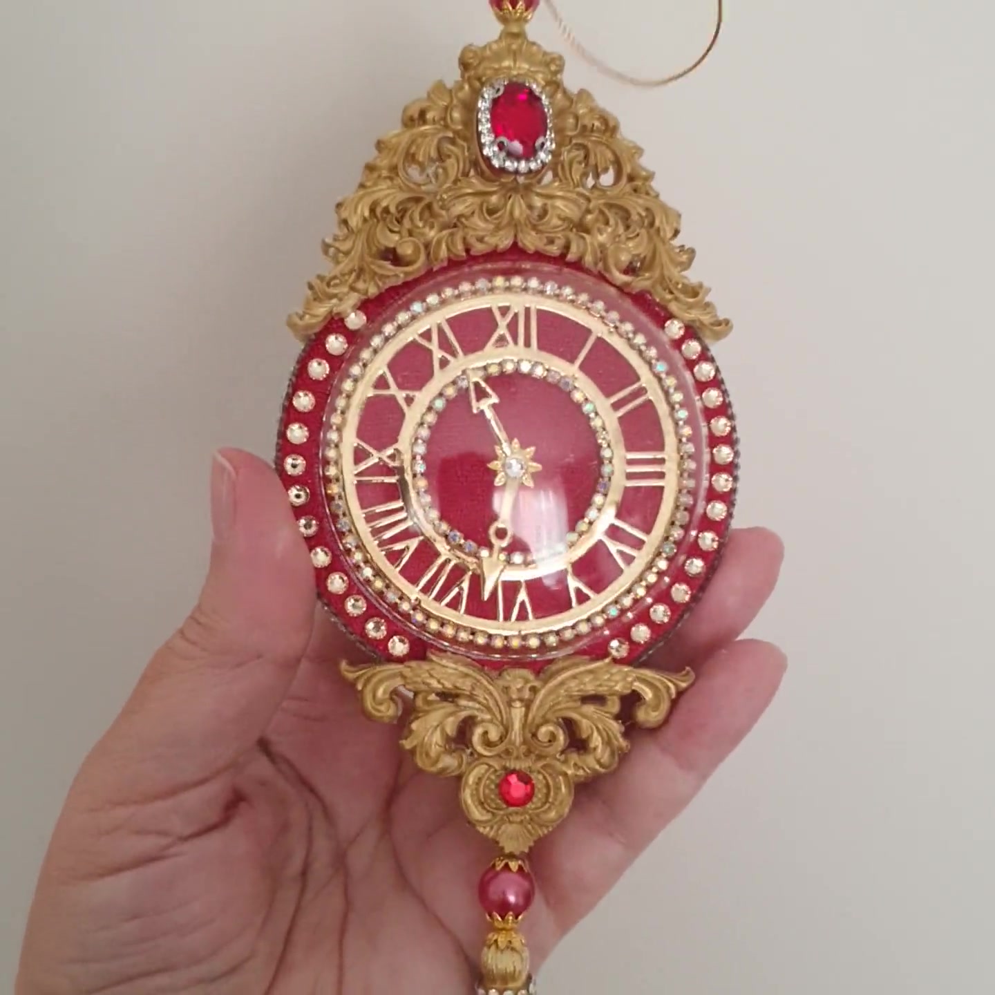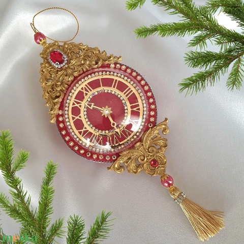 Kézzel készült piros karácsonyi óra – vintage dekoráció strasszokkal és bojtokkal, elegáns ünnepi ajándék