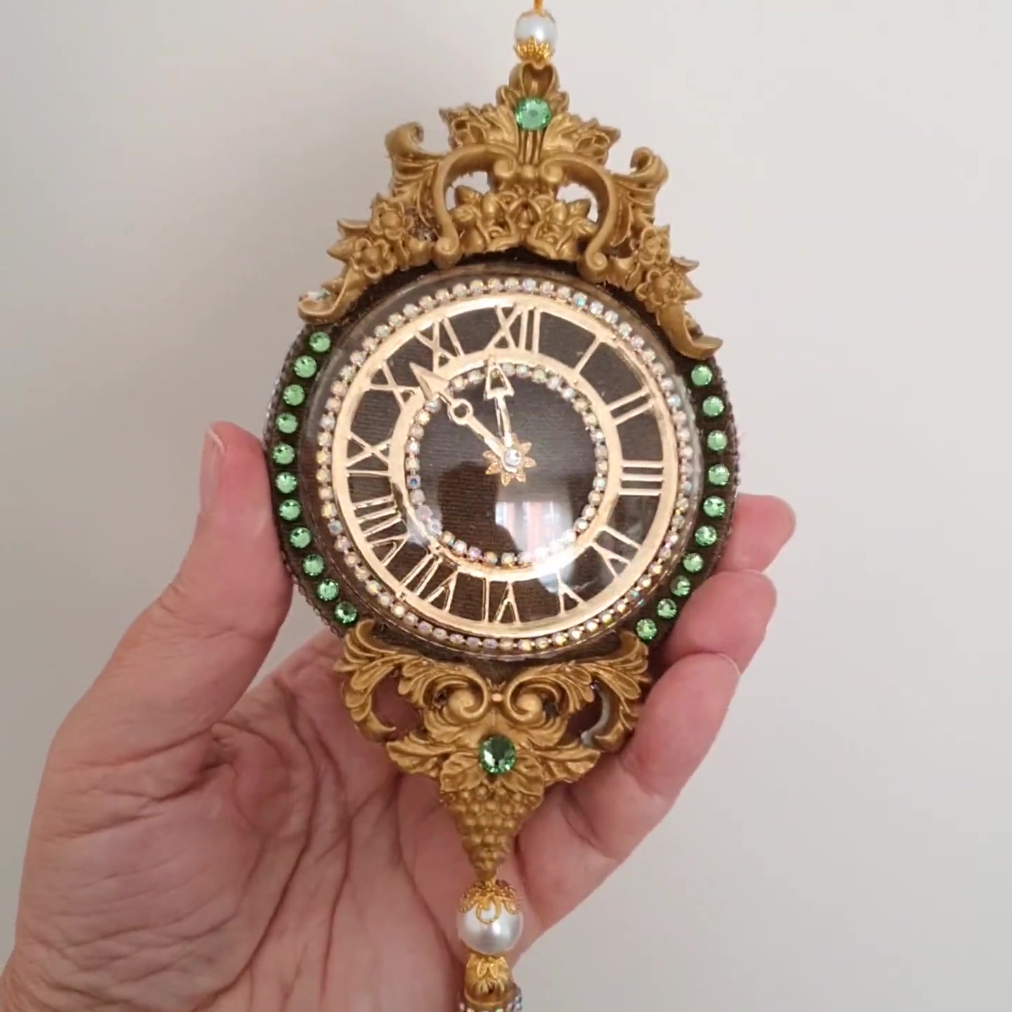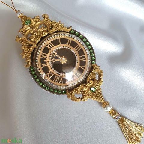 Kézzel készült olívazöld bársony karácsonyi óra – vintage stílusú dekoráció strasszokkal, bojtokkal, elegáns ünnepi dísz