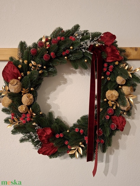 - Anyaga: szőllővessző alap, műfenyőág, bársonyszalag, mákgubó, akrilgyöngyök, csillogó termésdíszek, arany színű levelek, piros bogyók, bársony levelek