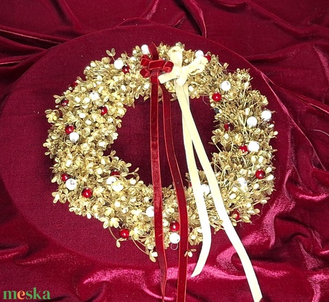 - Anyaga: szőlővessző alap, aranyozott virágok, szalag, bogyók