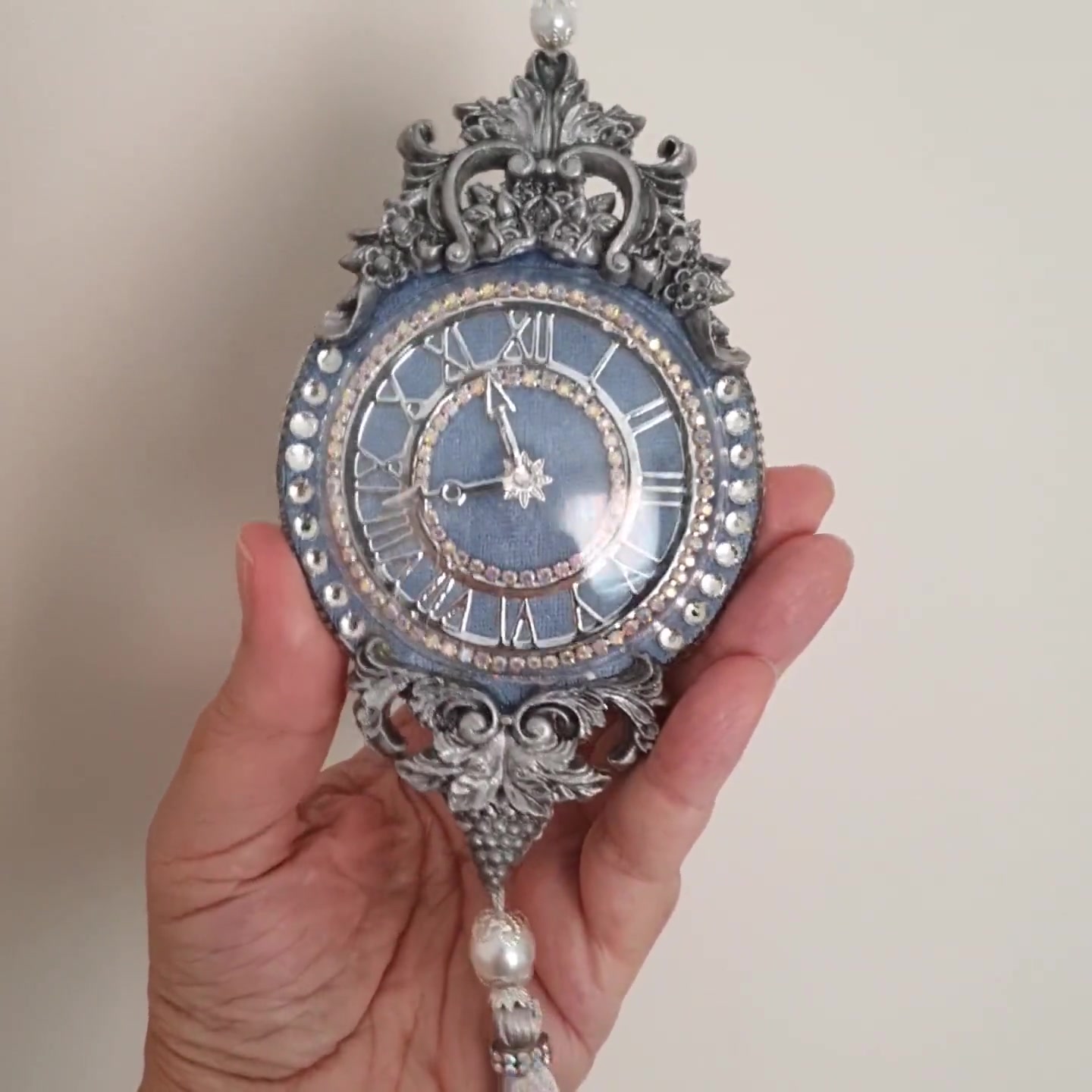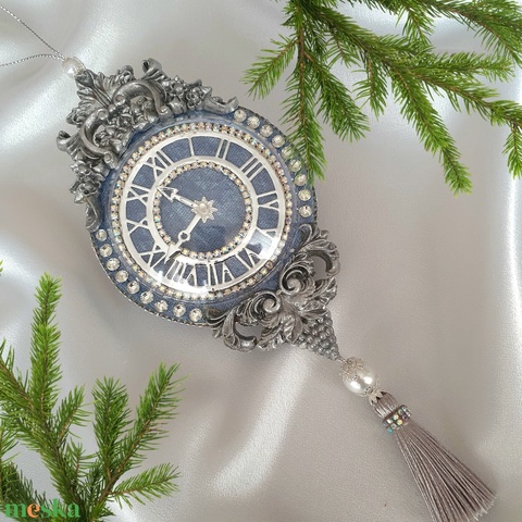 Kézzel készített világoskék bársony karácsonyi óra 8 cm – vintage karácsonyfadísz, limitált kiadás, elegáns dekoráció