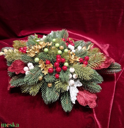 - Anyaga: bársony levelek, zúzmarás levelek, 3d fenyőág, arany színű levelek, fehér bogyók, piros bogyók, zöld bogyók, gyöngyök