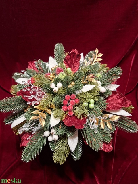 - Anyaga: 3d műfenyőág, bogyók, arany színű levelek, bársonylevelek, fehér csillogó levelek, akrilgyöngyök, zöld gyöngyök, piros gyöngyök, almácskák, fehér gyöngyök