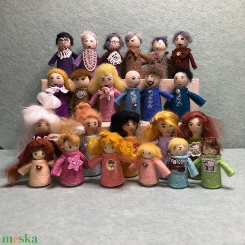fa, gyapjú, filc, selyem, üveg gyöngy, csipke, gombok