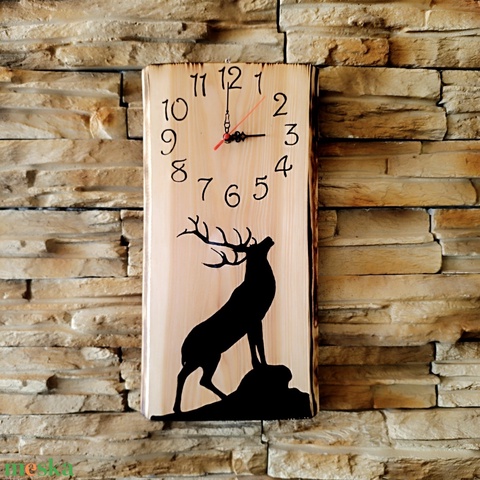 Nagyméretű fából készült falióra szarvas sziluettel díszítve