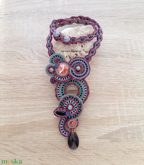 - Anyaga: sújtás zsinór, japán kása, cseh csiszolt gyöngy, ragasztó, cérna, nikkel mentes fémszerelék, strasszlánc, swarovszki