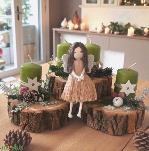 Különleges adventi koszorú fakorong alapon – zöld gyertyákkal, piros-fehér díszekkel és makramé angyalkával