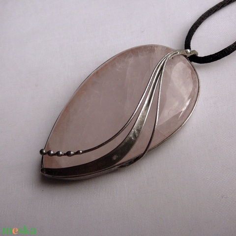 A medál Tiffany technikával készült rózsakvarc és ólommentes, ezüsttartalmú ón felhasználásával. A díszítés szintén saját készítésű, nem tartalmaz gyári elemeket. A fémrészt óezüstre patináztam és lelakkoztam, hogy sokáig szép maradjon.