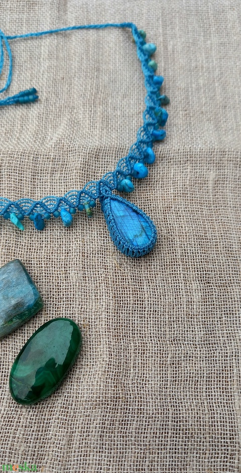 - Anyaga: linhasita viaszolt szál, japán kásagyöngy, labradorit ásványkaboson, opál ásványszemcsék