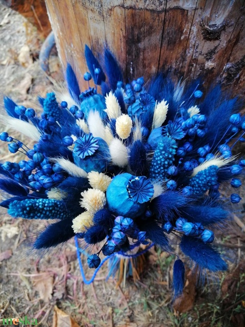 Menyasszonyi csokor natúr és királykék színű szárazvirágokból