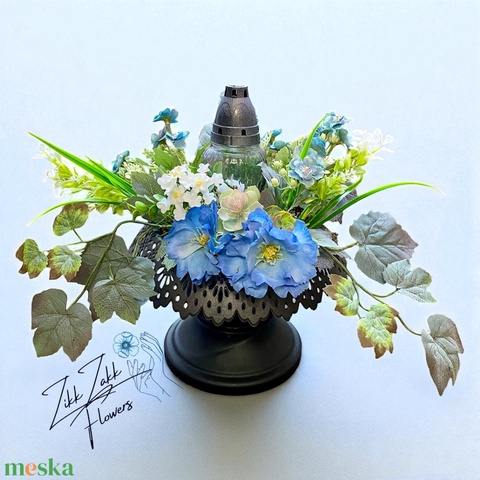Kék virágdísz mécsessel – elegáns kegyeleti kompozíció