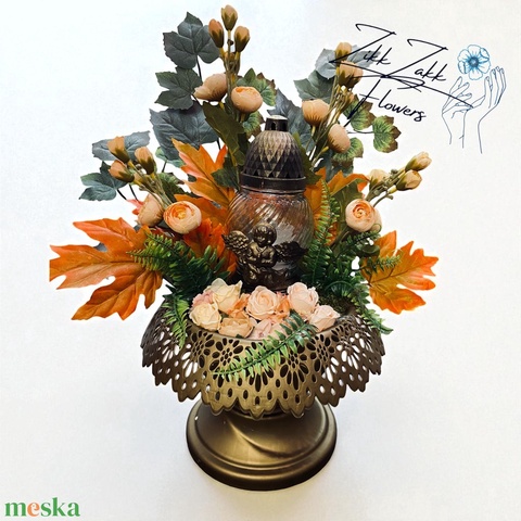 Őszi mécses dísz narancs levelekkel és angyalos mécsessel
