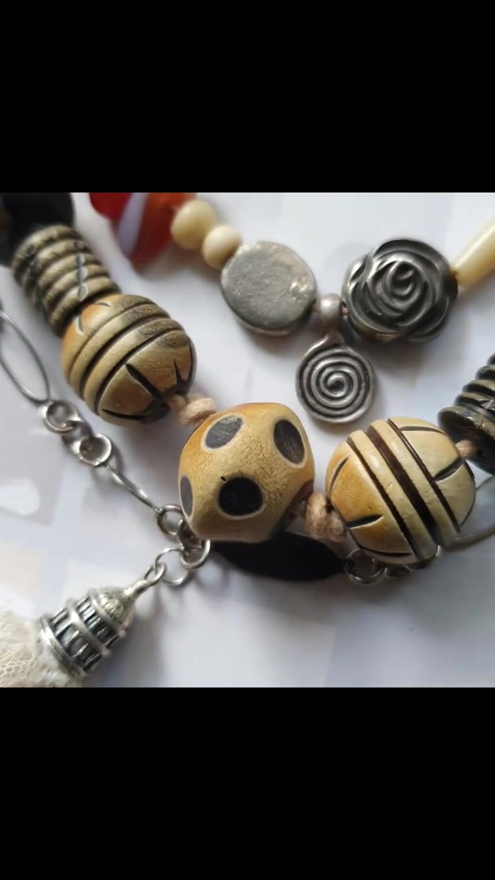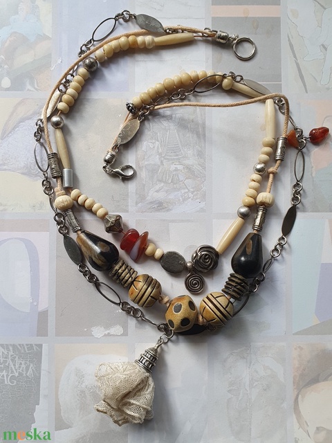 - Anyaga: fagyöngy, fém lánc, szerelékek, csipke, pamut zsinór, fém gyöngyök, csont gyöngy