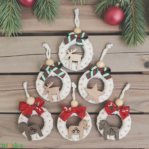 Makramé karácsonyfadísz szett – fehér, fa karikán, piros vagy zöld szalaggal
