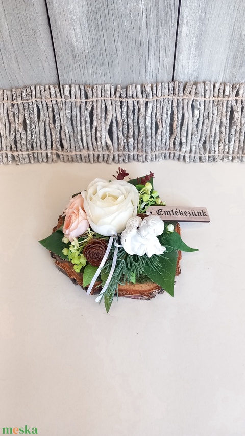 műlevelek, műnövények, műbogyók, nyírfaszelet, selyemvirág, tábla, angyalkafigura, szalag