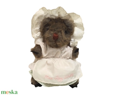 Vintage gyűjtői játék, Mrs Tiggy Winkle mackó néni, csipke ruhás vintage teddy maci néni, kosztümös vintage játék