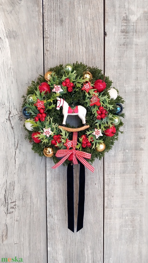 - Anyaga: műzöldek, műbogyók, fémcsengettyű, szalagok, fémgömbök, műzöldalap, dekorációk, hintalovacska