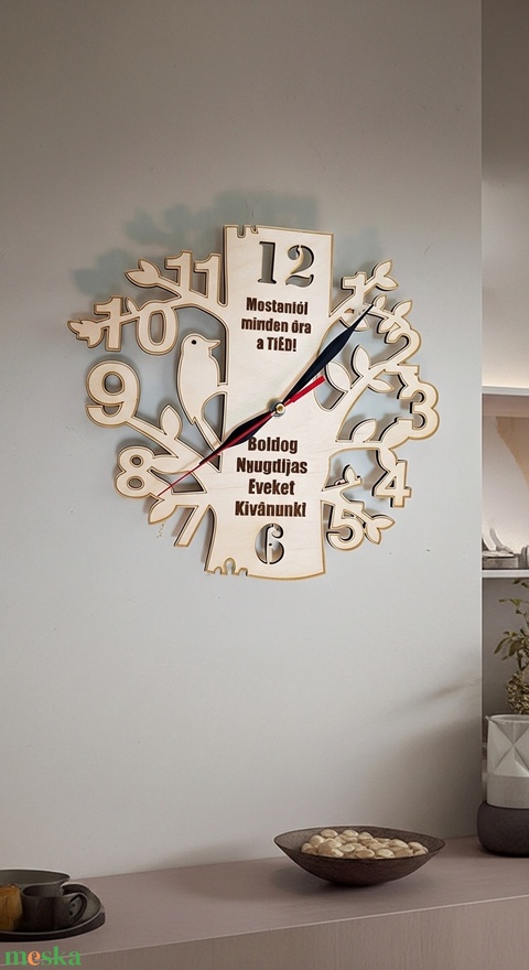 "Mostantól minden óra a TIÉD!" – ez a kedves üzenet díszíti ezt a fából készült, életfa motívummal ellátott faliórát. Tökéletesen kifejezi mindazt, amit a nyugdíjas évek jelentenek: a szabadságot, a nyugalmat és a saját idővel való rendelkezés örömét. Ez nem csupán egy óra, hanem egy szimbólum, egy szívhez szóló emlék, ami a lakás díszeként nap mint nap emlékeztetni fogja a tulajdonosát erre a csodás új életszakaszra.