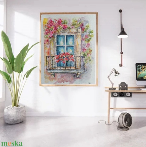 Mediterrán hangulatú akvarell, amely egy virágokkal teli ablak nyugalmát idézi. Színes, vidám, mégis letisztult darab.