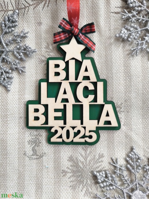 A dísz kérhető egy réteű fa, vagy két rétegű zöld hátteres kivitelben is. Megrendeléskor írd meg nekünk a díszre kért neveket, és mi már készítjük is.