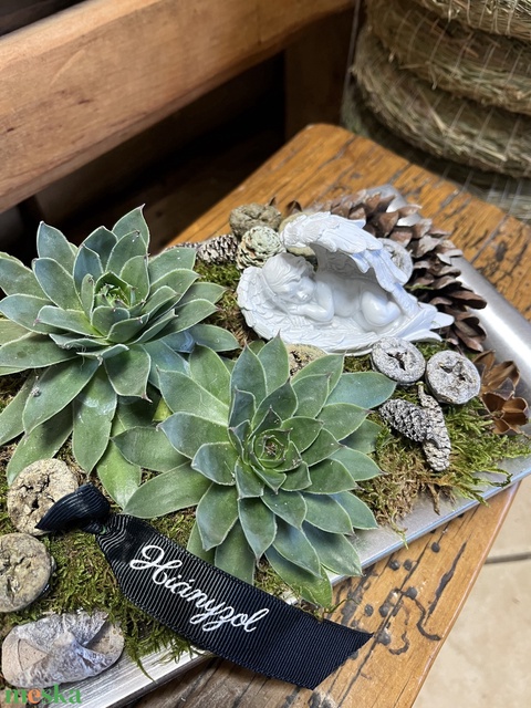 termések, angyal, moha, kövirózsa, műanyag tálca