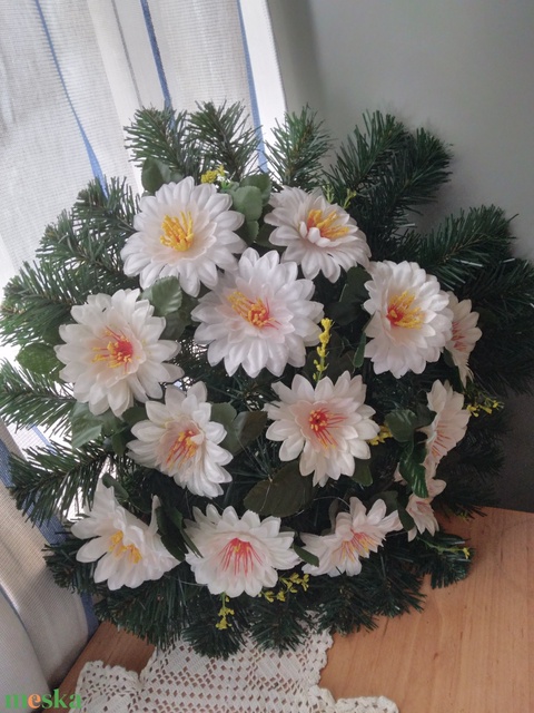 30 cm átmérőjű műfenyő koszorú alapon,fehér selyem virágok, / 13 db/