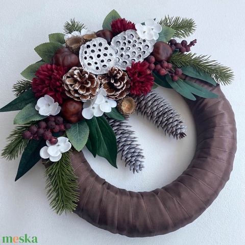 - Anyaga: koszorú alap, szárazvirág, toboz, selyemvirág, szalag
