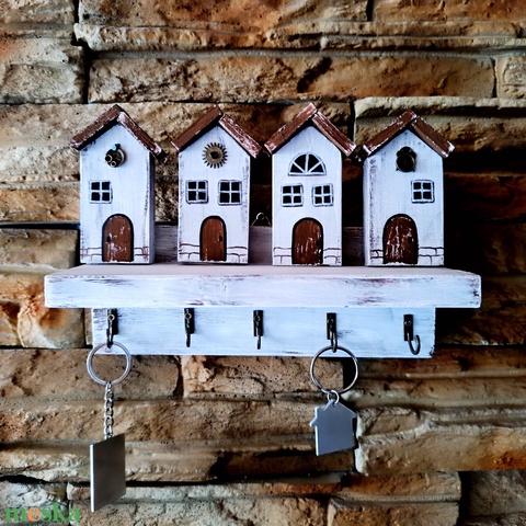 Egyedi, vintage stílusú fa fali kulcstartó házikókkal