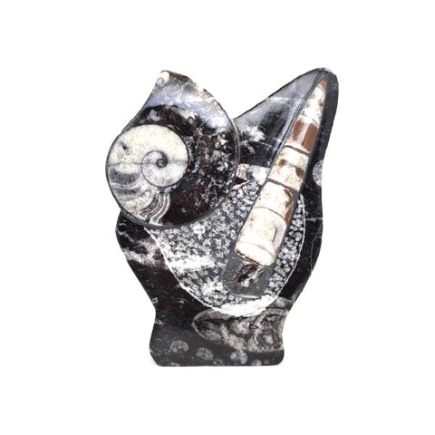 Álló Ortocerász és Ammonitesz fosszília dísz 15cm – Marokkói fekete kőzet