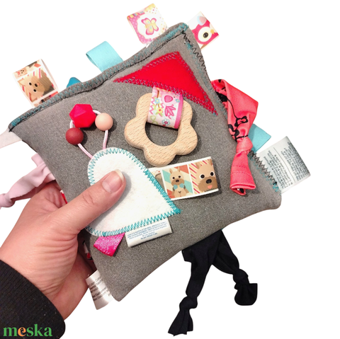 Különböző tapintású és mintájú anyagokból varrtam, sok-sok szalaggal, madzaggal, letépőzárazható tépőzárral, puha szilikon gyöngy van rajta erős madzagra rögzítve.
