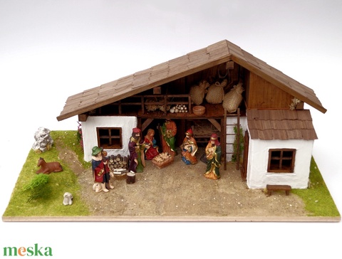 A jászol teljes egészében fából és minőségi modellező anyagokból készül, kézzel összeállítva és díszítve. Minden apró elem – a fa szerkezet, a szalmaszálak, a kisméretű raktározott zsákok, a tűzifa és a kis kosarak – szeretettel és precizitással készült, hogy életre keltse a betlehemi istálló meghitt hangulatát.
