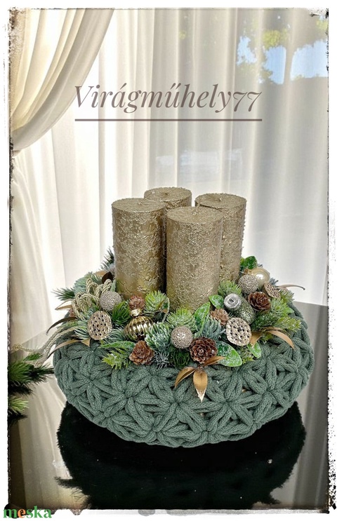 - Anyaga: szalma alap, fonal, gyertya, művirágok, üveggömbök