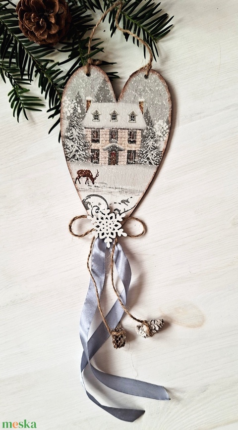 Havas erdei ház- szíves függődísz, adventi, karácsonyi dekoráció, ajtódísz