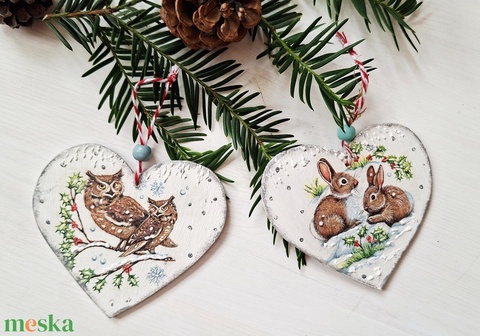 Tél az erdőn -Baglyok és nyuszik- karácsonyi szívecskék, 1 pár