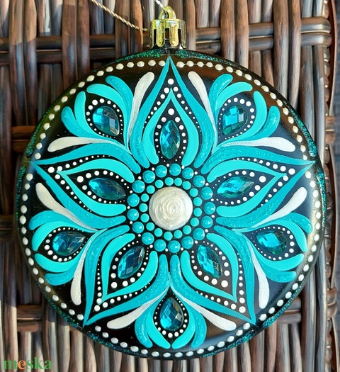 Kézzel festett, egyedi karácsonyfadísz mandala mintával, türkízkék színben 1 db