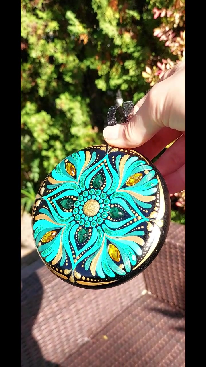 Kézzel festett, egyedi karácsonyfadísz mandala mintával, türkíz zöldes és arany színekkel 1 db