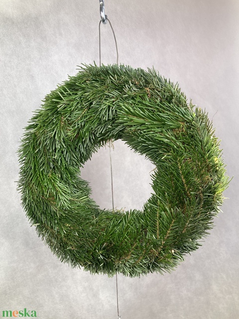30 cm átmérőjű alapra készült, flokkolt zöld makkos Nordmann fenyős, tovább is díszíthető koszorú (NK-10)