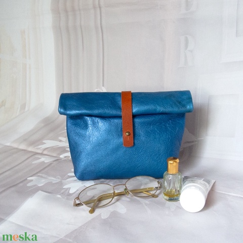 Borjúbőr kozmetikai táska, Kék metálfényű bőr utazószervező, Szemüvegtartó, Tolltartó