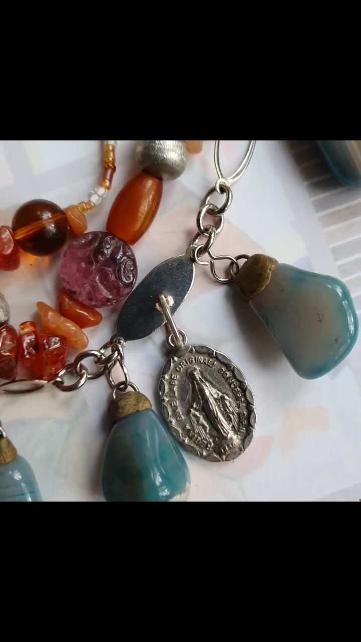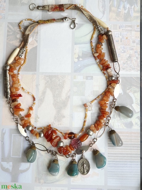 - Anyaga: cseh gyöngy, karneol gyöngyök, achát foglalatban, fém lánc, szerelékek, gyöngyfüző cérna, textilek