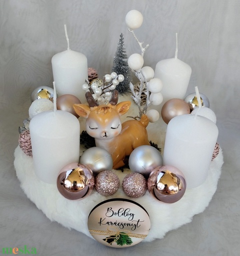 Fehér szőrmés adventi koszorú szarvassal