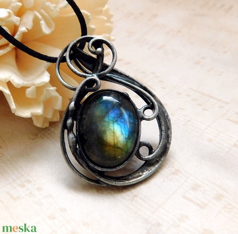 A medál Tiffany technikával készült labradorit, réz és ólommentes, ezüsttartalmú ón felhasználásával. A díszítés szintén saját készítésű, nem tartalmaz gyári elemeket. A fémrészt óezüstre patináztam és lelakkoztam, hogy sokáig szép maradjon.