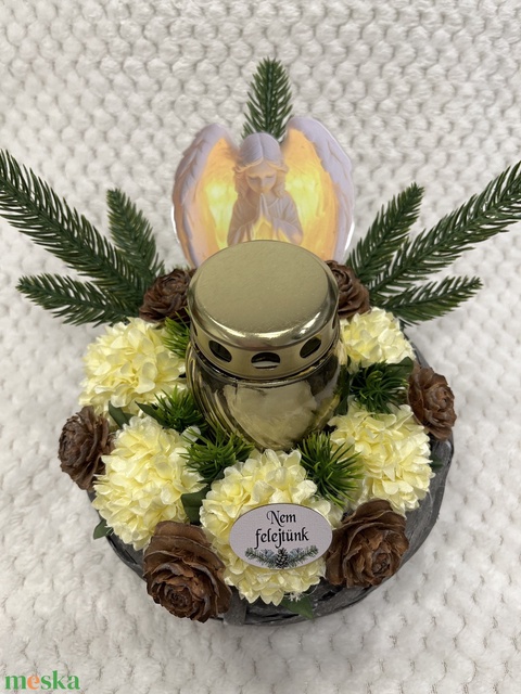 Kerek, fonott sírdísz vajszínű krizantémokkal és cédrusrózsákkal