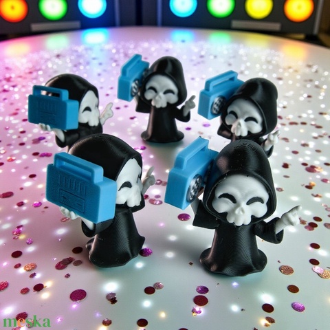 Ki mondta, hogy a kaszás nem tud mulatni? A DJ Kaszás bebizonyítja, hogy még a túlvilágon is dübörög a ritmus! Ez a mókás, 3D nyomtatott figura fekete csuhában, kék kazettás rádióval a vállán érkezik, és készen áll, hogy feldobja a nappalid, íróasztalod vagy a DJ-pultod hangulatát.