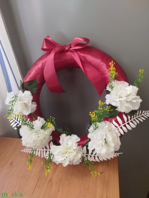 30 cm átmérőjű szalma koszorú sötét piros selyem szalaggal bevonva, fehér szegfűvel és páfrány levéllel díszítve